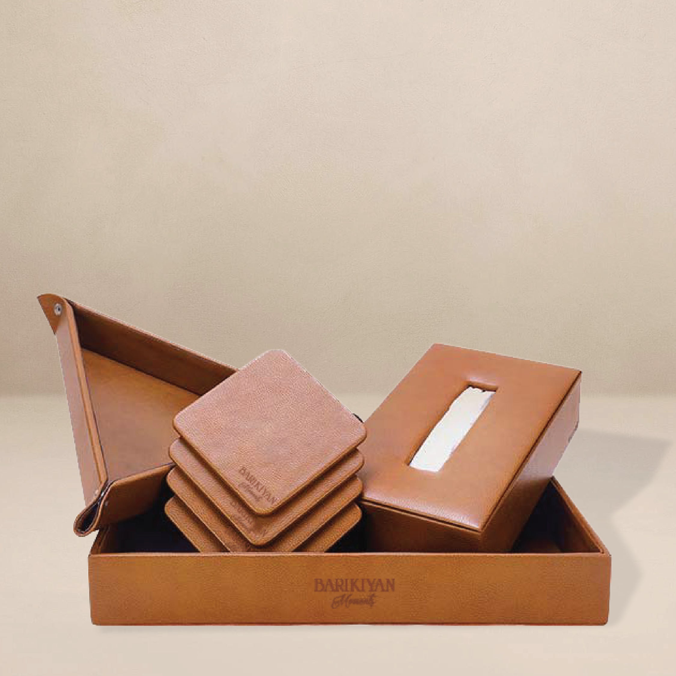BARIKIYAN Luxury Leather Home Décor Set – Tissue Box, Coasters & Tray -
